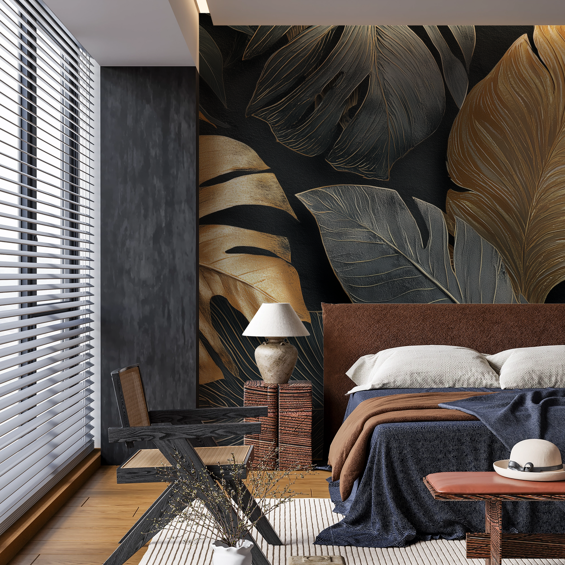 Perfect for those looking for: gold tropical wall mural, modern botanical wallpaper, dark glam home decor, luxury jungle aesthetic wall trends.