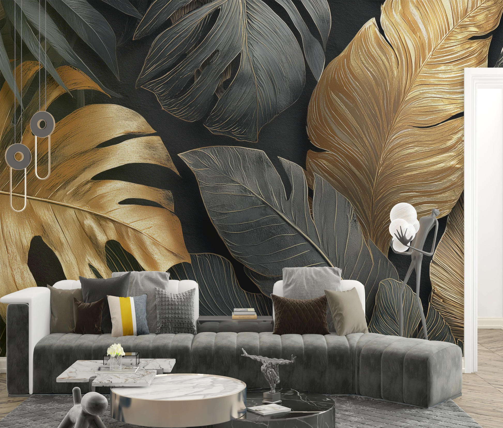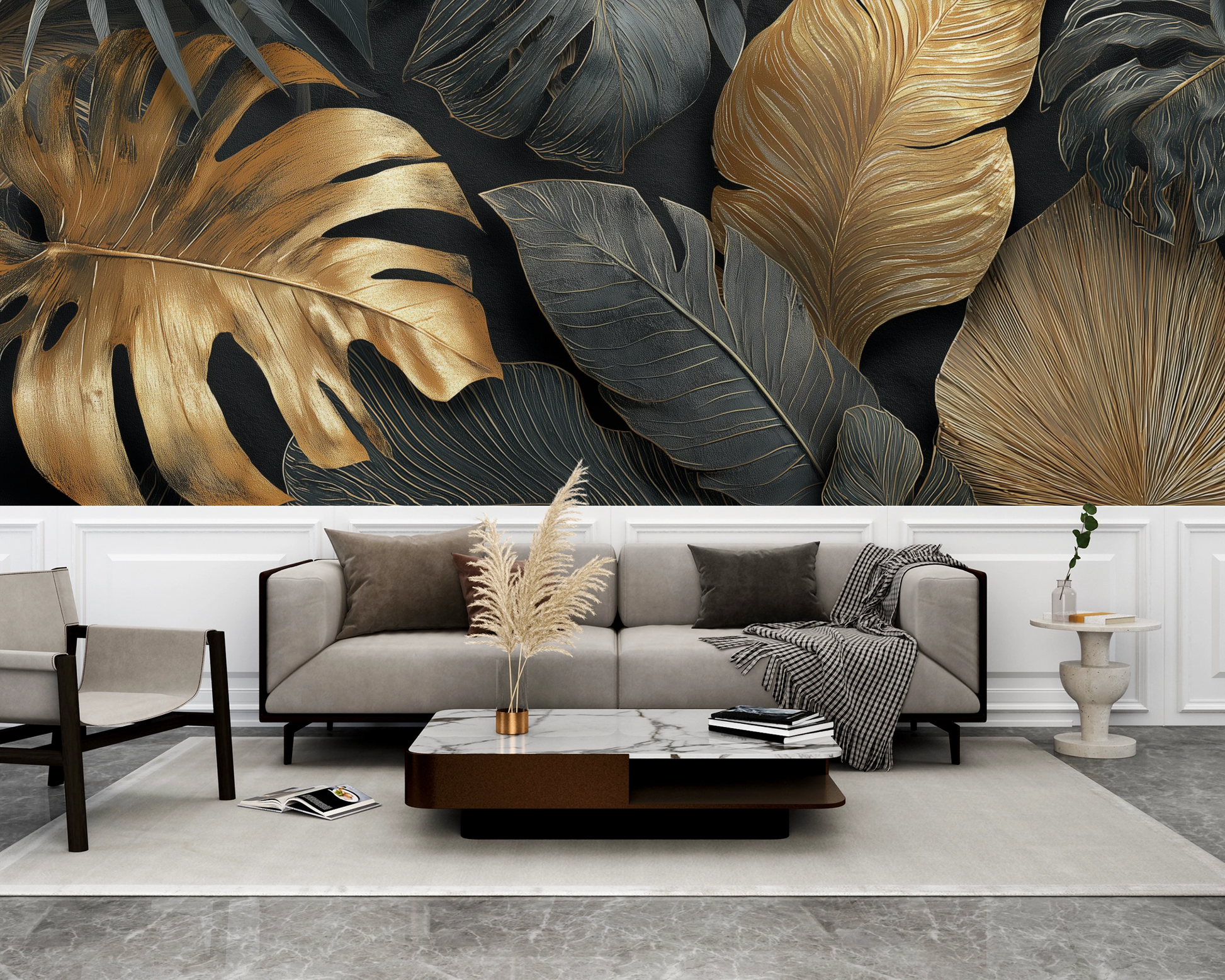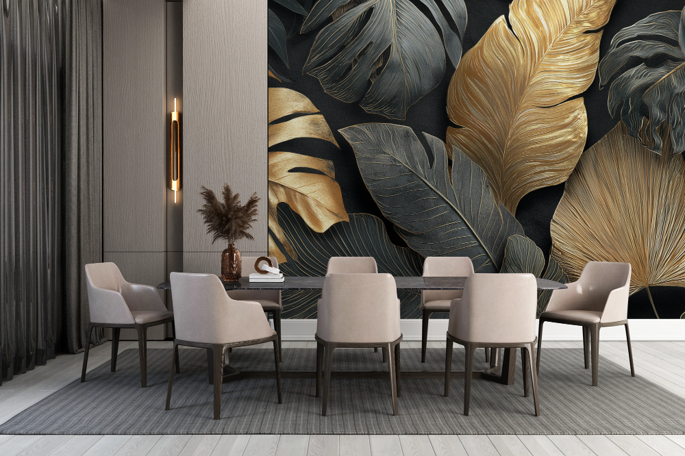 A Lush Mural for Modern Glam Spaces. This mural feels like stepping into a dreamy, golden jungle at midnight. With every leaf brushed in soft metallic gold and deep charcoal tones, it brings warmth, elegance, and just the right amount of drama to any room. Whether you're styling a cozy living area, a boutique space, or a bold bedroom wall, this design adds texture and richness without overwhelming the space. It’s where modern tropical vibes meet quiet luxury — a true statement piece that turns walls into art.